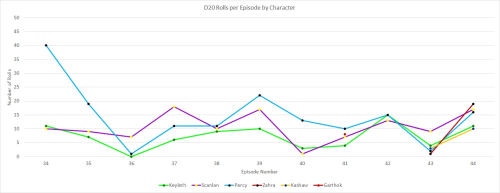 @dragonmustang01 has been a long time contributor to the All Rolls project, as well as many others. Well, after we finally published, she decided to add up how many rolls have actually been made by each character, as well as graph how many they rolled each episode. Thanks, Lauren, and enjoy her handiwork and commentary!
